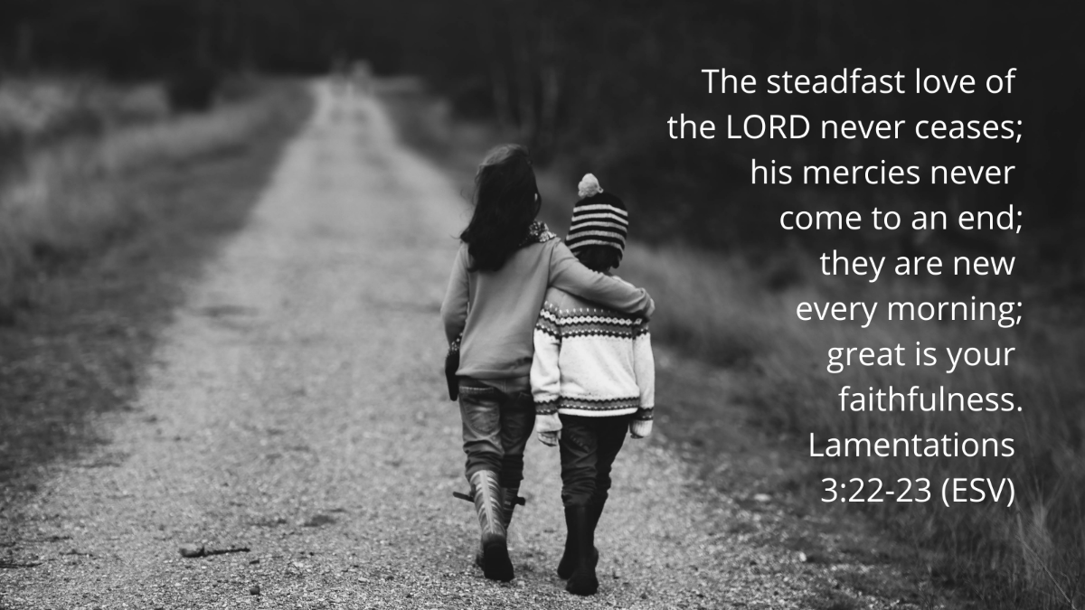 Two children arm in arm walking down a gravel road with quotation of Lamentations 3:22-23, ESV